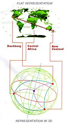 Was Einstein just a German quarterback? Turn the page, because these are real physics, to the absolute level. We’re talking Evronian geodesics. Forgets every notion of physics you’ve ever accidentally picked up: Our invaders’ perception of reality is much different than ours. The emotional waves they feed off have lengths that go way beyond anything ever measured: only the Evronian perceptive system is capable of picking up the emotional charge of living creatures. But the emotional currents of a planet are too vast to be “seen”. For that reason the Evronians have developed a geometrical system capable of finding the nodes in the currents, with a technique that makes it as easy as finding the centre of a triangle. On this chart you can see an approximate representation of Earth’s obtuseness. As you can tell, the sum of all the internal angles is not 180 degrees but zero, also known as a straight line.